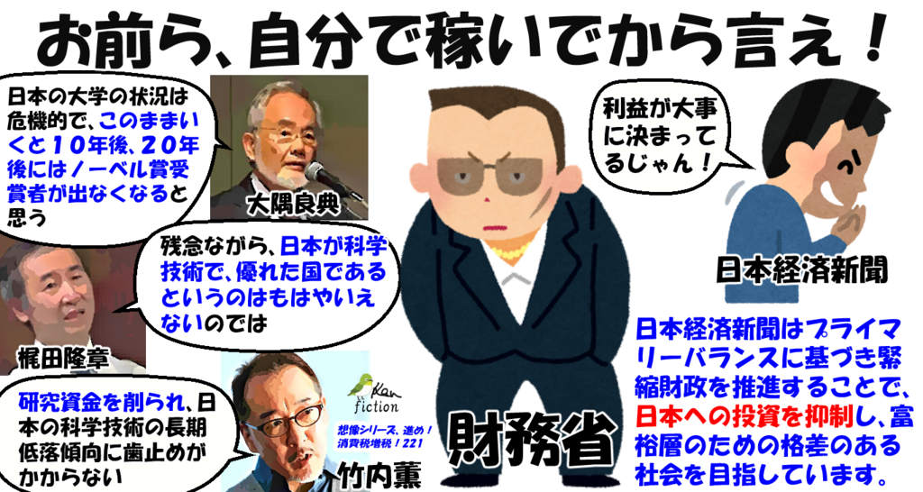 2018-01-07 お前ら、自分で稼いでから言え! 〇消費税増税を推進する日本経済新聞を批判する漫画を描いてpixivに掲載しています(想像も入っています)。よろしければご覧ください。 〇なお、問題等のある場合には、お手数ですが、コメント欄に記載願います。速やかに削除、修正等の対応を行います。 以上/ご覧いただきありがとうございました。